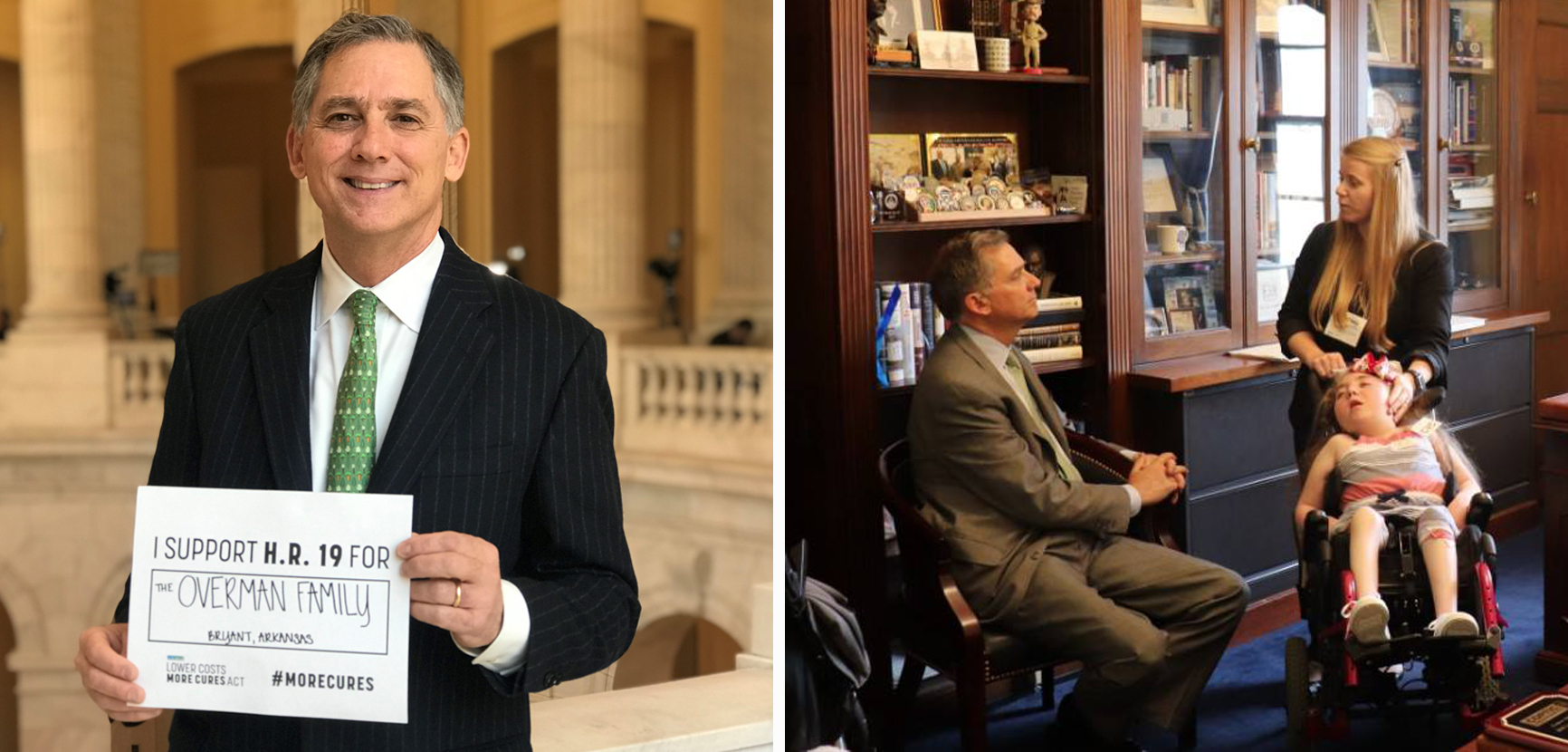 | Pictured below: Congressman Hill met with Lindsey Overman and her daughter Skylar, from Bryant, Arkansas in his Washington, D.C. office. Skylar was diagnosed with a rare condition called Schizencephaly and her family is focused on treating her symptoms. The Lower Costs, More Cures Act encourages innovation of new treatments which could help the Overman family. |